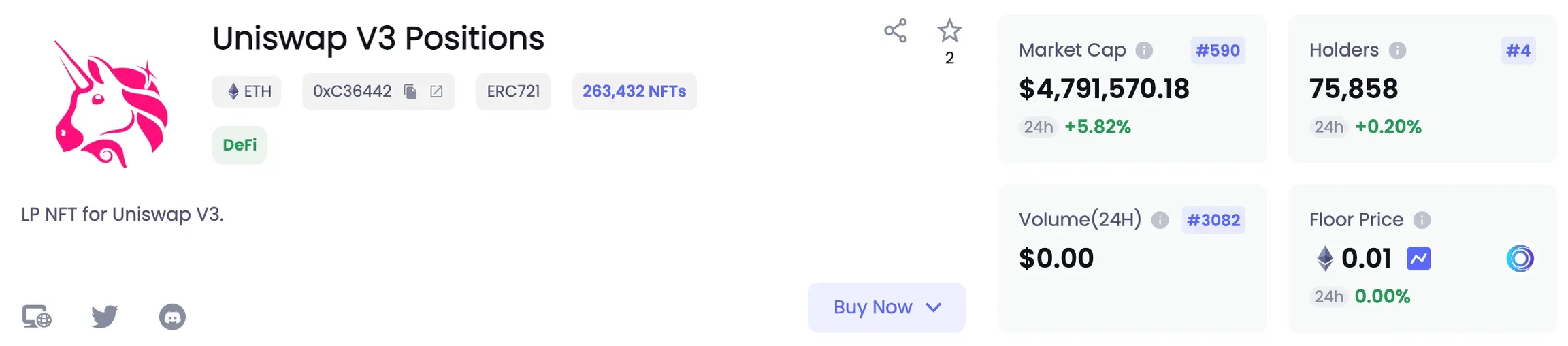 Along with the Fortune Teller collection, the Uniswap V3 Positions collection is also composed exclusively of NFTs with a specific utility towards the owner. In the case of Uniswap Positions, each NFT represents the position an investor takes when providing liquidity to a liquidity pool on the Uniswap platform. This provides the secondary option of having a Non-Fungible token to represent the position instead of a Fungible one as seen in previous versions of Uniswap.