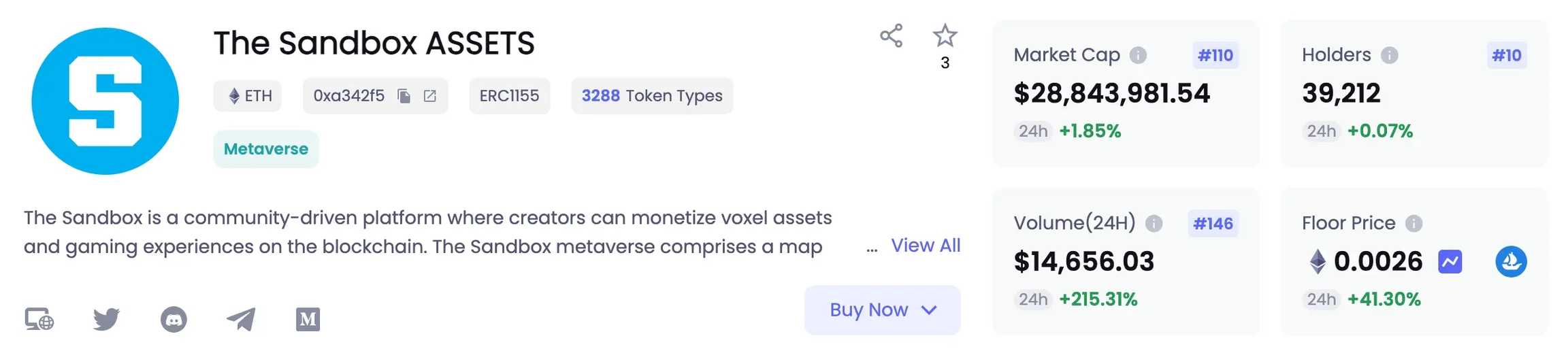 The Metaverse is a category that has incrementally been providing more and more utility options for NFTs as assets to each specific digital environment. The Sandbox Assetsarrow-up-right collection on the Ethereum blockchain has been one of the leading metaverse assets collections in regards to market cap and daily trading volume. The unique tokens available in this collection represent a wide variety of disposable items and assets for the digital environment of the Sandbox. The 3D models for sale range from avatars, to weapons, all the way to completely furnished properties.