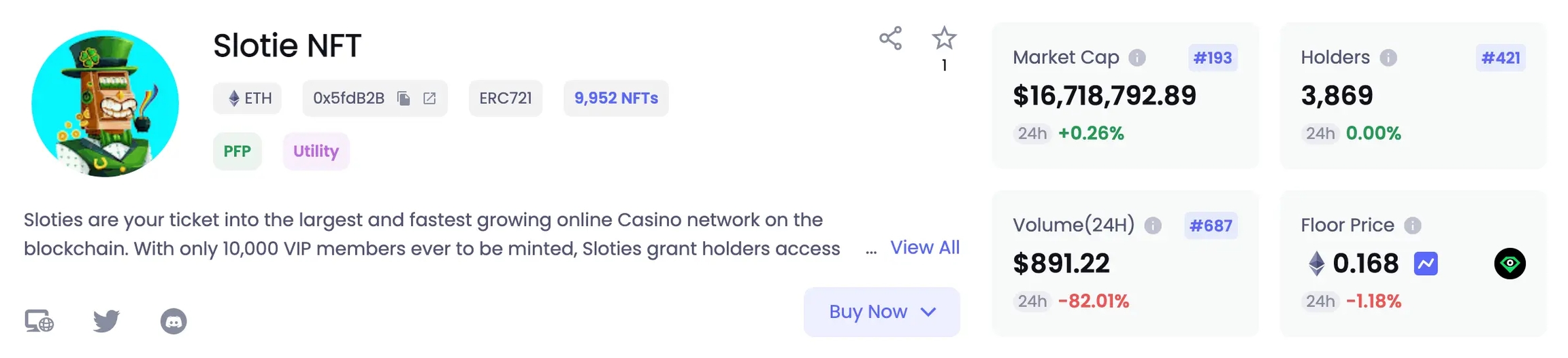 Although NFTs with utility has been the driver of this piece and their features have been looked at in many different market sectors, the notable mention within the category “Utility” would be the Slotie NFTarrow-up-right collection. This collection was created to bring the Casino experience to the blockchain. An NFT carries not only access to the Casino network behind the collection but also benefits in over 150 Casinos worldwide. In this case, access to the Casino community is the main utility, but each NFT also provides different rewards possibilities within the Slotie supported platforms.